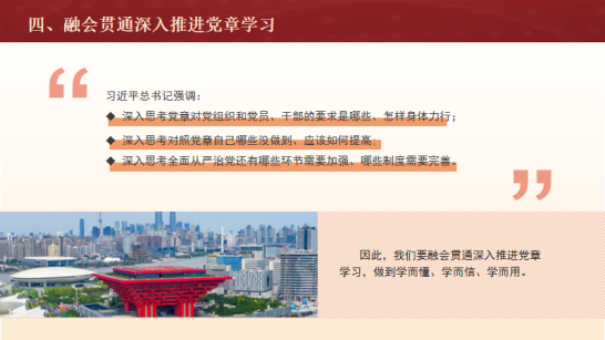 支部要求全体党员以习近平新时代中国特色社会主义思想为指引,认真学习新党章的内涵,领会其精神,以新党章中对党员的要求作为行动的准则。牢固树立自觉遵守党章的意识,坚决维护党章。要融会贯通深入推进党章学习,既要做到从党章文本出发,原原本本学、反反复复学,做到知其然。又要联系实际学、深入思考学,做到知其所以然。只有边学习、边思考、边实践,才能真正掌握党章的科学体系和精神实质,做到自觉用党章规范自己的一言一行,达到学以立德、学以增智、学以笃行的效果,进而成为学习和遵守党章的模范。