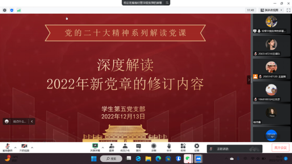高瞻远瞩绘蓝图,踔厉奋发谱新篇。为深入学习宣传贯彻党的二十大精神,引导支部党员牢固树立党章意识,全面理解党章内容,时刻遵守并践行党章,2022年12月13日晚,太阳成集团tyc33455员工第五党支部组织开展党的二十大精神系列党课之学习《中国共产党章程(修正案)》。由党支部书记主讲,全体党员参加。