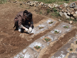 党员张茜,利用假期帮助家里进行播种,她用锥子挖开土,放下种子再掩埋,种完后浇点水。农耕的过程是快乐的,对于她来说这并不是体验,而是从小到大必做之事。村民们从来没有放弃过土地,即便是儿女早已成才,可以接他们去过不必辛劳的生活,即便是种地的收成其实并不多,但在他们心中,这才是实实在在的安慰。