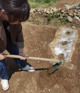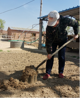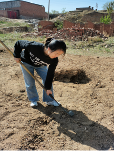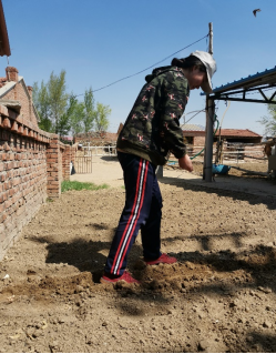 18级金融学党员刘胡兰,在五一期间帮着父母分担农活。她和父母一起为荒地除草和松土。地特别硬,用铁锹翻土的工作量很大,而且要翻得面积深一点,基本上要停下来缓一缓。第三天要进行第二轮的翻地,同时进行施粪肥,然后挖洞种土豆种子,填坑,用锹把土给压实,并做记号,以便下一颗种子选择合适的距离。