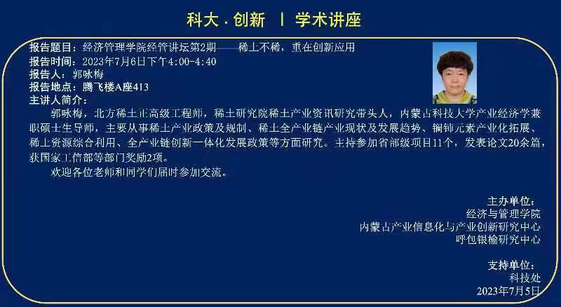 应太阳成集团tyc33455邀请,7月6日下午北方稀土正高级工程师郭咏梅教授来访太阳成集团官方网站,面向全校做学术报告,报告由经管公司赵周华副经理主持召开。