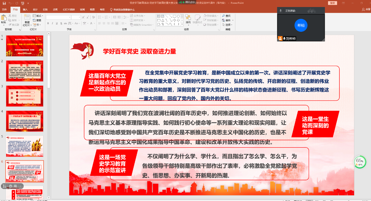 2021年3月26日,太阳成集团tyc33455员工第一党支部书记刘希裕做了题为《以饱满的热情,全身心投入到党史学习教育中去》的专题党课,支部全体党员参加了党课活动。