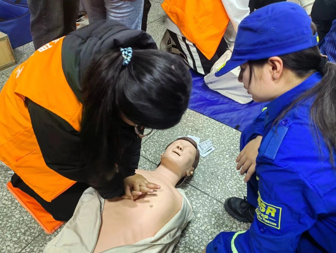 活动开始,老员工蓝天救援队的主讲人利用真实案例,为志愿者们讲解了在发生紧急情况时懂得急救的重要性,越了解一些急救知识,就越可能在危急关头拯救他人生命.随后,老员工蓝天救援队的队员通过假人模型为志愿者们亲身示范心肺复苏的全过程。紧接着,在救援队员的指导和鼓励下,志愿者们亲身体验了完整的救援过程。活动的最后,志愿者们配合老员工蓝天救援队利用AED教具为大家展示了电击除颤的方法。同时,救援队也再次为志愿者们科普了海姆立克急救法.