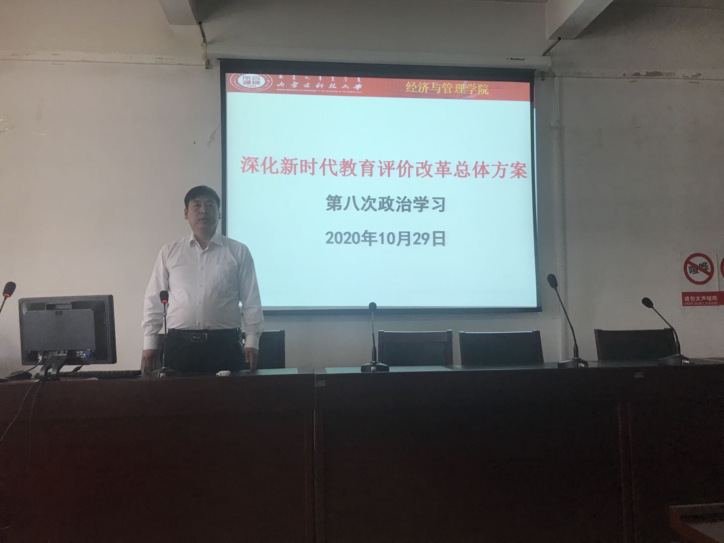 2020年10月中共中央、国务院印发了《深化新时代教育评价改革总体方案》,并发出通知,要求各地区各部门结合实际认真贯彻落实。会议学习了《深化新时代教育评价改革总体方案》的时代背景、总体要求、主要任务和组织落实等四个方面内容,重点学习了改进高等公司评价、改革教师评价、改革员工评价等三个内容。会议号召,全体教师认真学习中央文件精神,主动适应评价改革导向,牢记为党育人、为国育才使命,培养德智体美劳全面发展的社会主义建设者和接班人。
