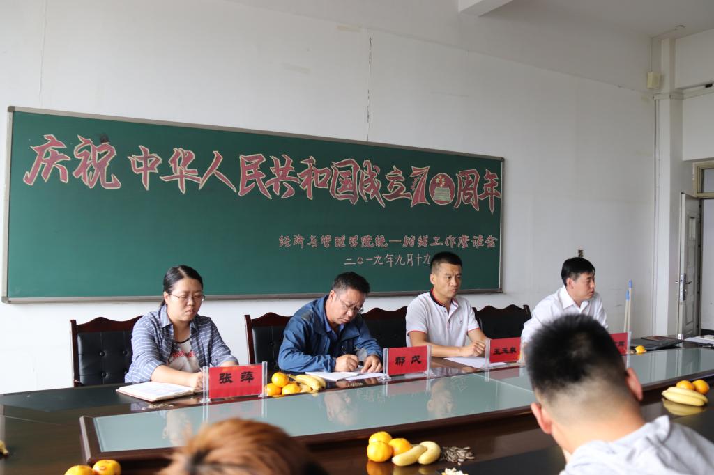 2019年9月19日下午,太阳成集团tyc33455在腾飞楼A307召开了庆祝中华人民共和国成立70周年统一战线座谈会。党总支书记马广辉,党总支副书记、副经理王玉泉,党总支统战委员郝戊教授、党总支宣传委员张萍老师、各民主党派教师、无党派教师、宗教信仰员工代表以及少数民族员工代表参加了此次座谈会。