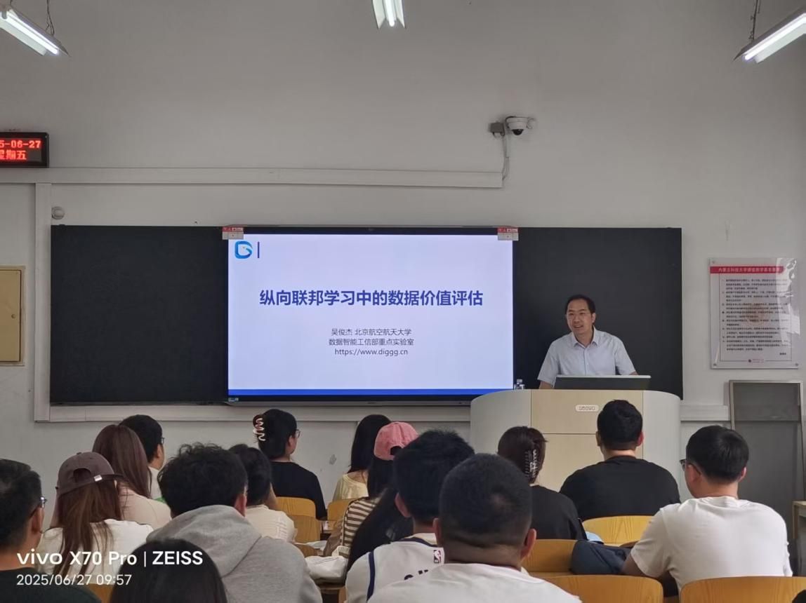 6月27日,北京航空航天大学吴俊杰教授应邀来到太阳成集团tyc33455,就“基于联邦学习的数据价值评估”与师生们进行座谈交流和学术讲座,为师生们带来了一场精彩的学术盛宴。 讲座中,吴教授聚焦联邦学习框架下的数据价值评估问题,系统梳理了该领域的最新研究进展。他深入浅出地介绍了多种主流评估方法的理论基础、适用场景与优缺点。吴教授结合其团队的前沿探索,重点分享了如何克服数据异质性、通信成本、激励机制设计等实际挑战,提出了更高效与更公平的价值评估新思路和新框架,并通过生动的案例阐释了这些方法在实践中的应用潜力与价值。 互动环节气氛活跃,与会师生就联邦学习评估方法的计算效率、实际部署中的隐私与安全边界、不同行业应用的特殊性等问题,与吴教授进行了深入的探讨和交流。吴教授渊博的学识、深刻的洞见以及对前沿方向的精准把握,赢得了在场师生的阵阵掌声。 此次学术交流活动吸引了众多师生参与,现场气氛热烈。吴教授的讲座不仅深化了师生们对联邦学习及数据价值评估这一关键问题的理解,也为公司相关学科方向的建设和人才培养提供了重要启发。
