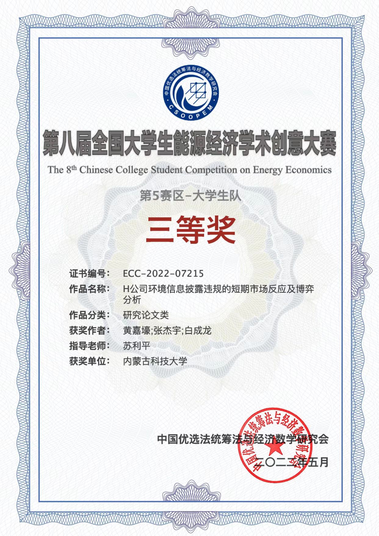 上一条:太阳成集团tyc33455师生荣获第八届全国老员工能源经济学术创意大赛三等奖